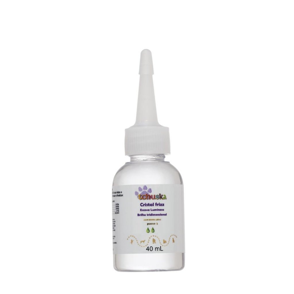Aplicação: Após soprar o pêlo do animal para retirar o excesso de água, aplicar uma pequena quantidade de Cristal Frizz Tchuska nas mãos e espalhe por toda a pelagem. Secar o animal normalmente e aplicar novamente o Cristal Frizz como finalizador para cristalização do brilho sobre os pêlos.