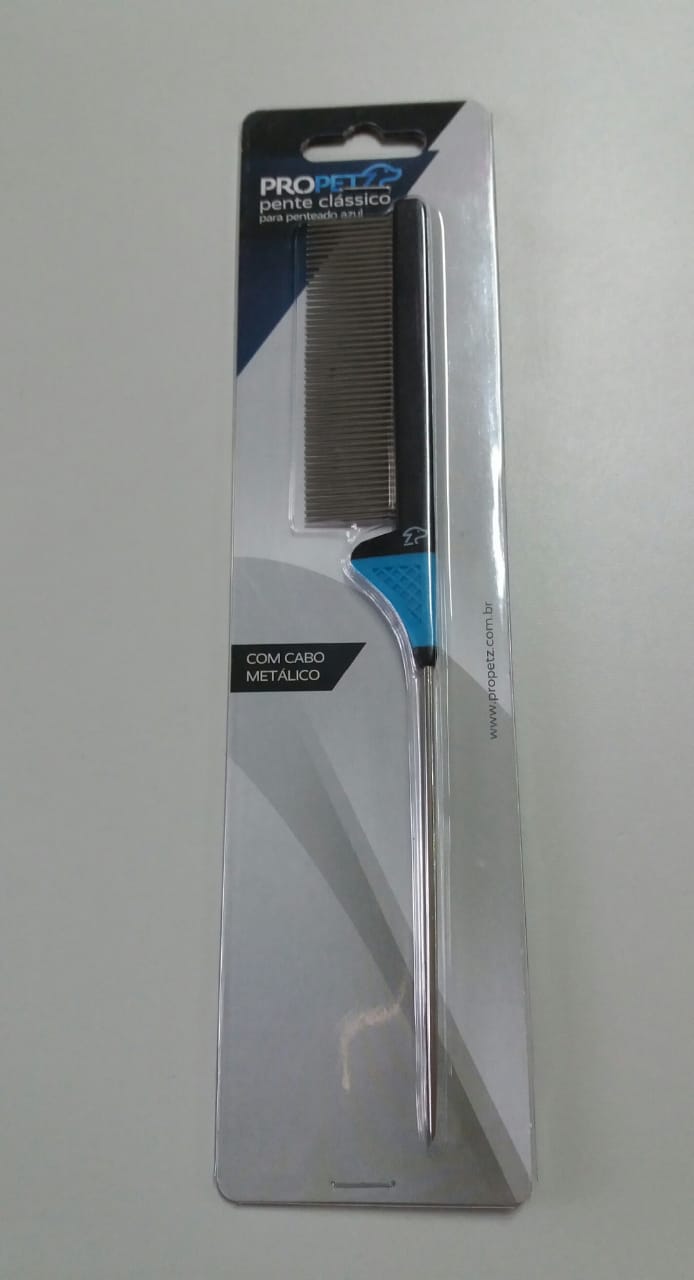 Pente com 45 dentes metálicos e cabo com ponteira pra dividir o pelo. Ideal pra penteados e tosas. Resistente, leve e prático. Marca: Propetz.