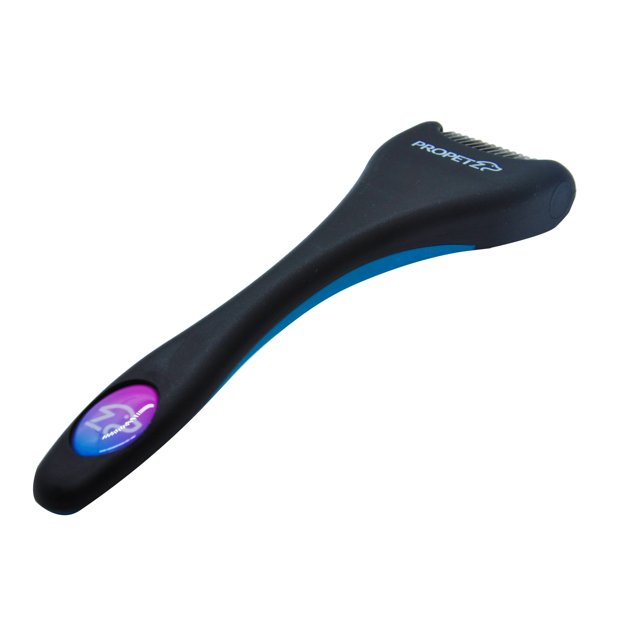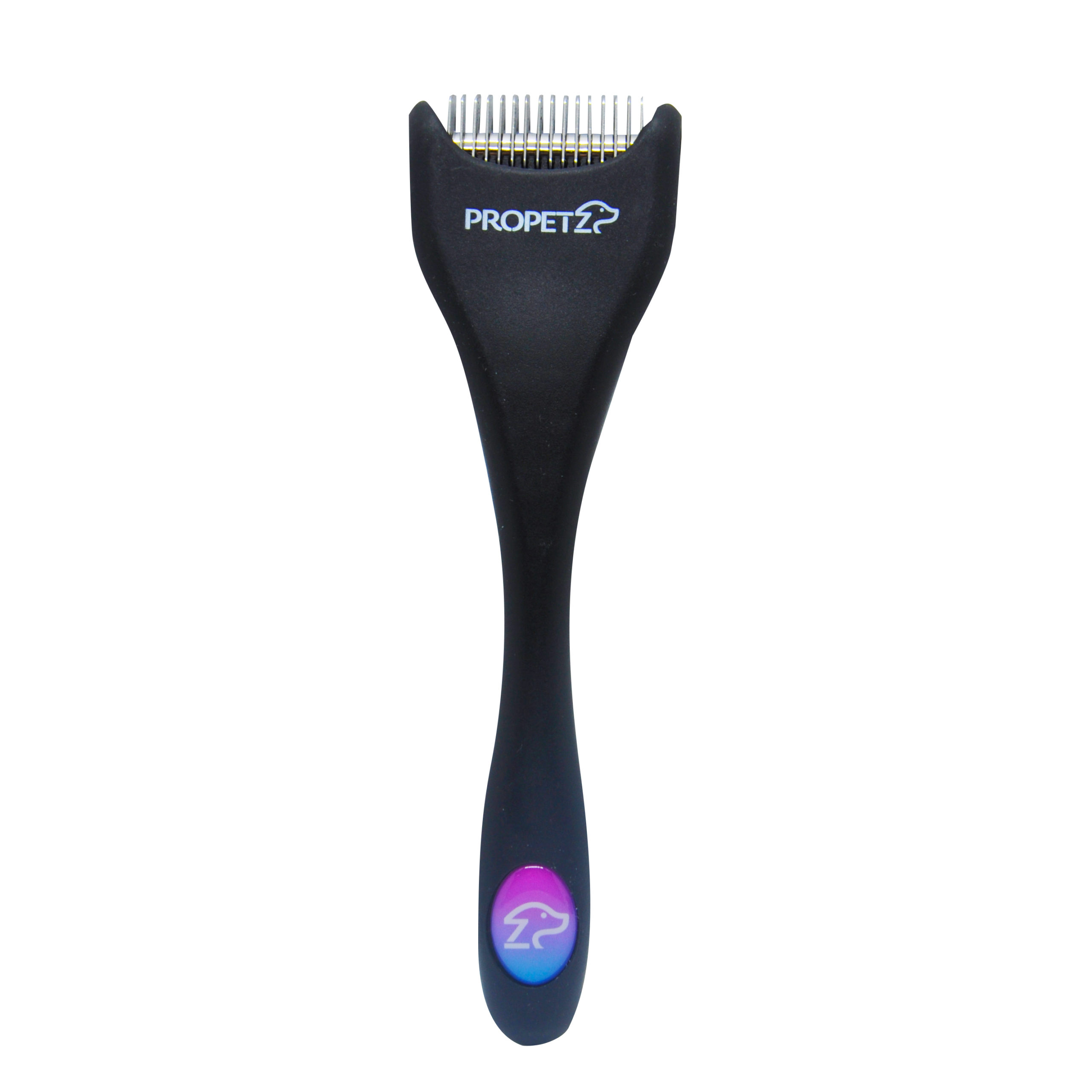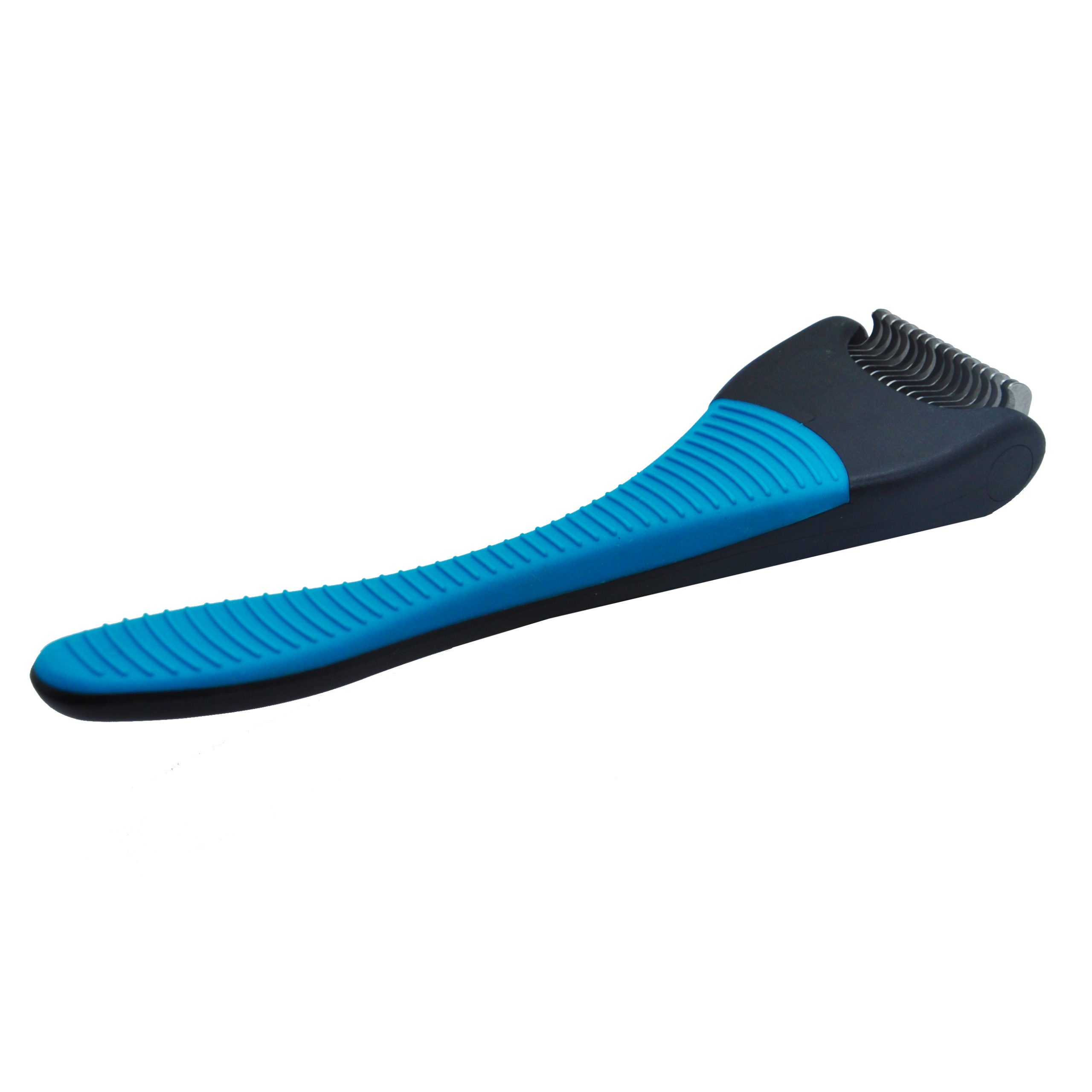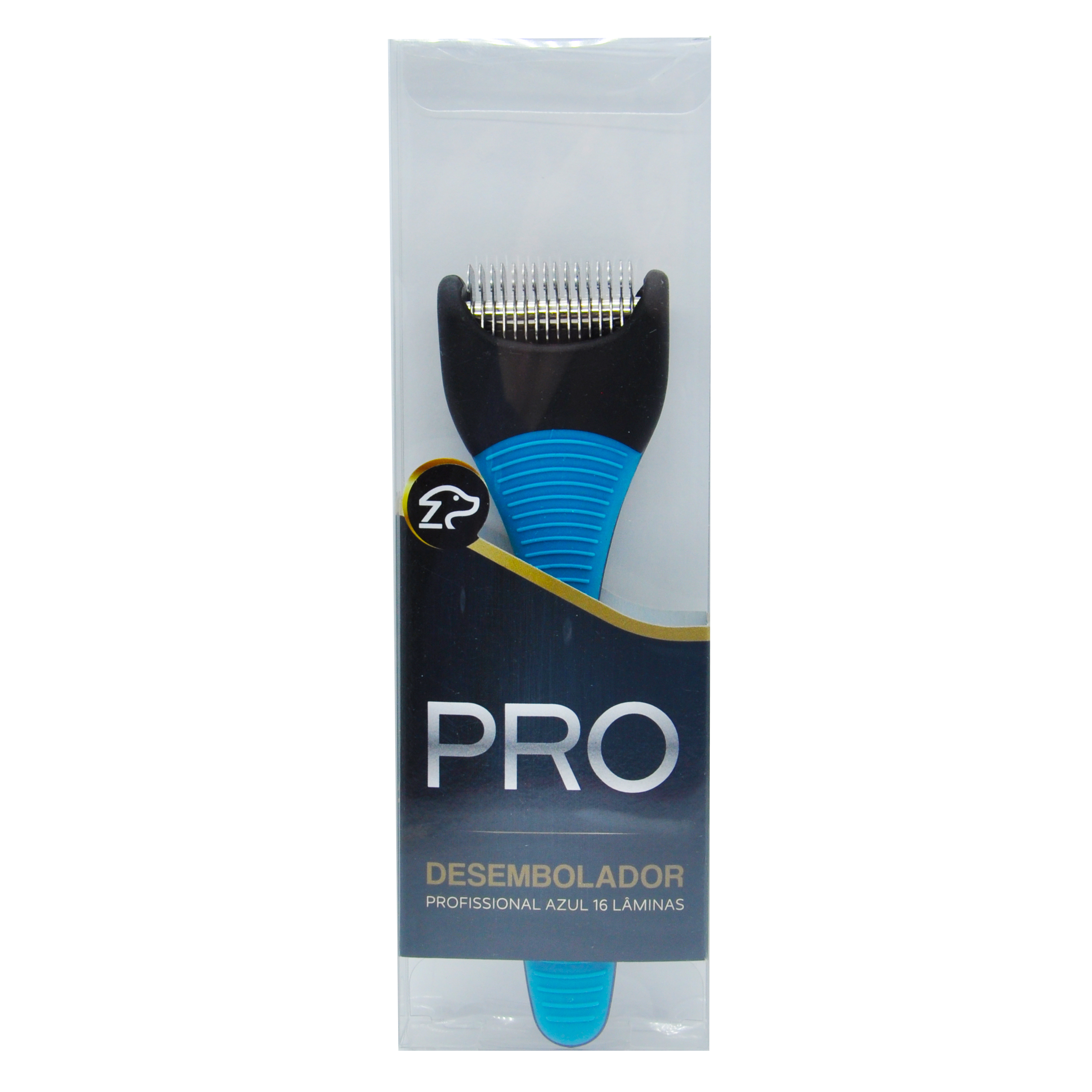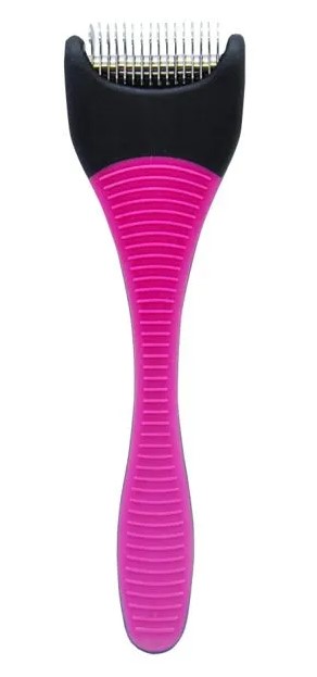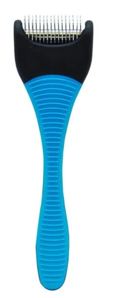 _ Possui 16 lâminas de aço inoxidável em formato curvo bem afiadas que permitem o desembaraço do pelo sem danos e sem chances de cortes no animal.